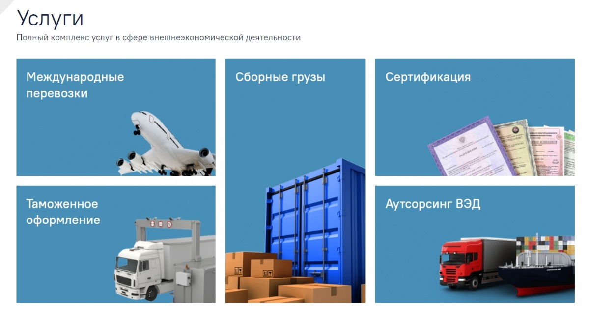 Для удобства наших клиентов мы оказываем полный комплекс услуг в сфере внешнеэкономической деятельности: таможенное оформление, международные перевозки, сертификация, аутсорсинг ВЭД.